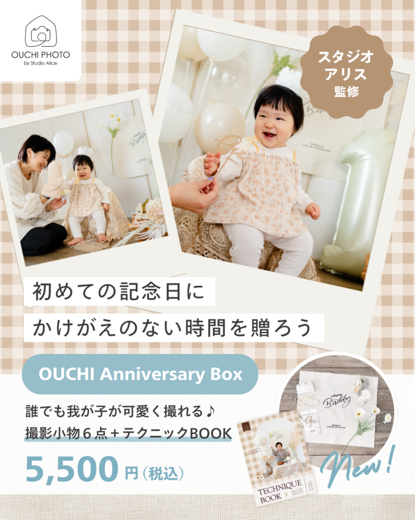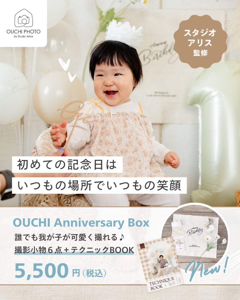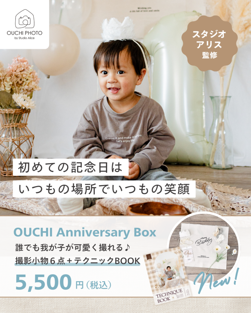 でもお家で撮影ブースを作るとなると、撮影小物を用意しなきゃならないのが、時間もかかるし大変…!自分のセンスにも自信がないし、、といったお悩みに応えるべく『これを飾れば誰でも素敵に記念日撮影ができる!』撮影小物BOXをご用意。それがOUCHI PHOTOの「OUCHI Anniversary Box」です。